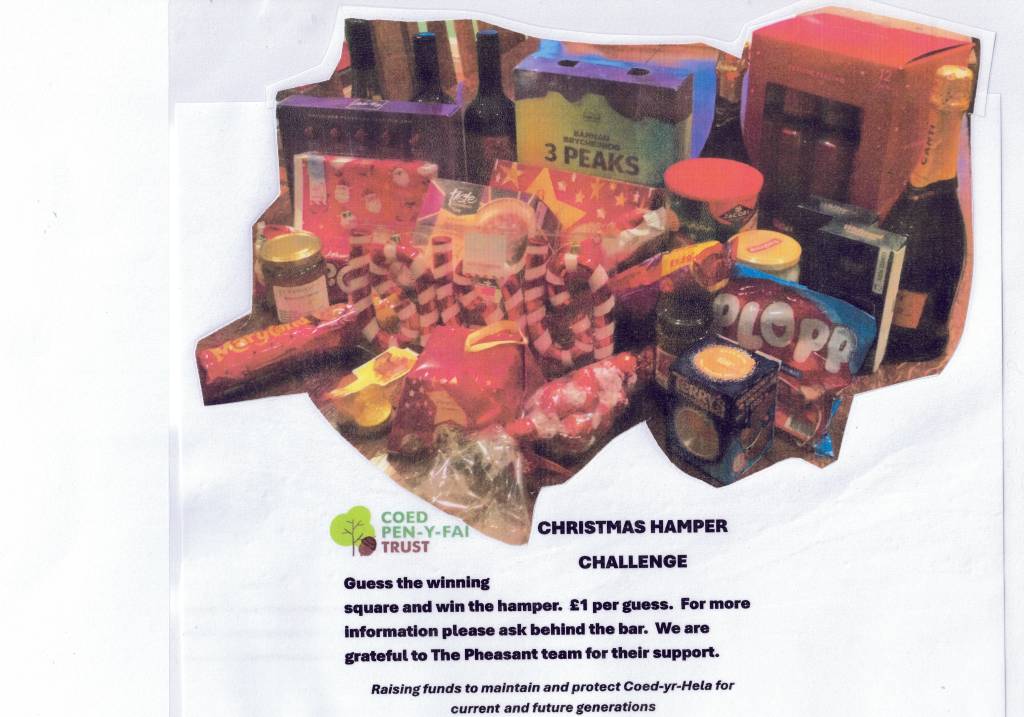 We are grateful to The Pheasant, Pen-y-fai, for hosting our meetings during the year and for agreeing to hold our ‘Christmas Winning Square Challenge’ there. Don’t miss the opportunity to win the hamper, just buy a square (or several!). The hamper is packed with treats and Christmas cheer. We’d like to say thank you for the kind donations received from Brecon Brewing, Cadbury’s, Lindt, Tytanglwyst Farm, Whittards and many others.